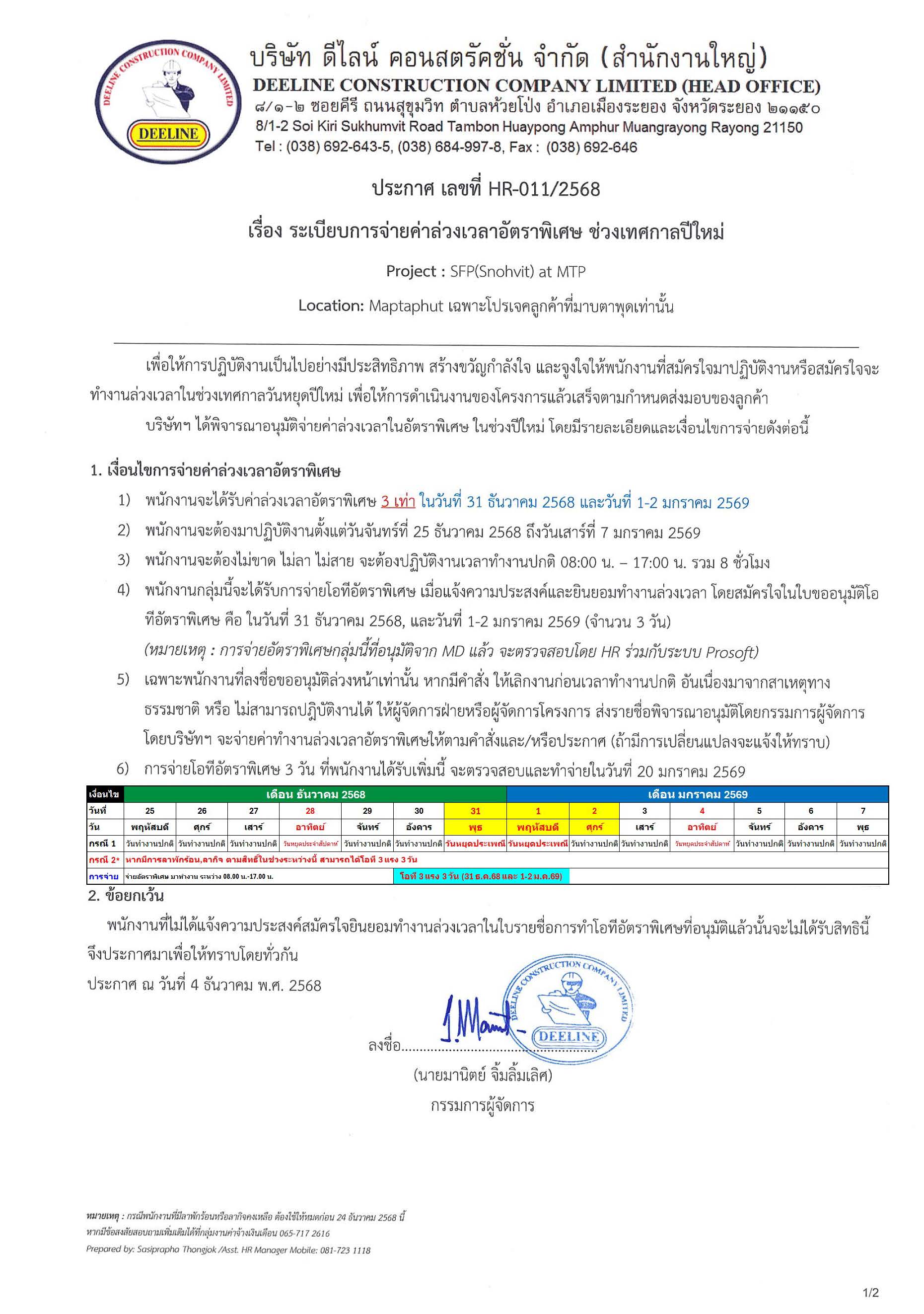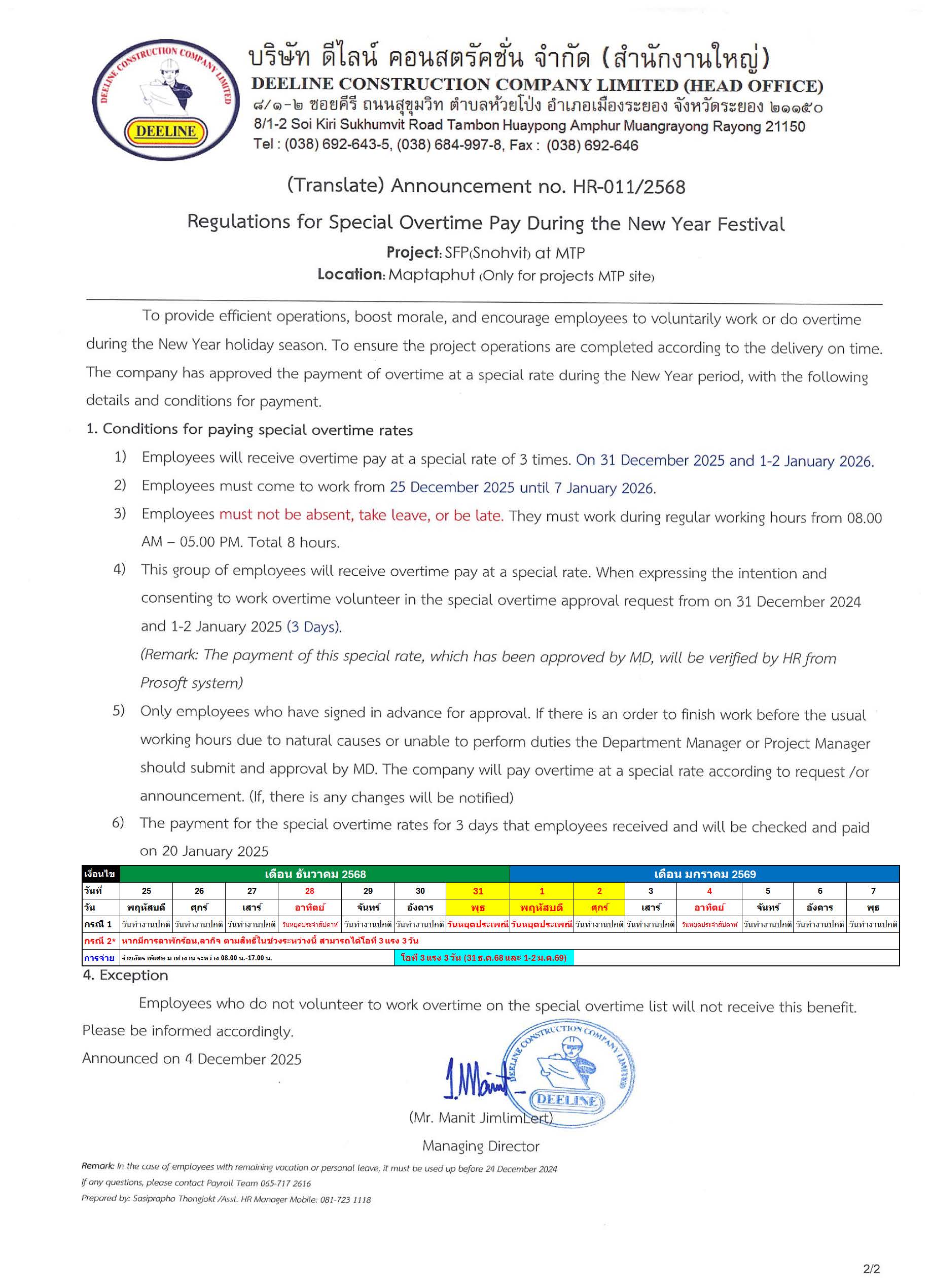 บริษัทไม่มีนโยบายที่จะให้พนักงานทำงานล่วงเวลา,ทำงานในวันหยุด, หรือทำงานล่วงเวลาในวันหยุด เว้นแต่ในกรณีจำเป็น จึงจำเป็นต้องให้พนักงานทำงานนอกเวลาทำงานปกติ หรือเกินเวลาทำงานปกติ หรือทำงานในวันหยุด และทำงานล่วงเวลาในวันหยุดเท่าที่จำเป็น โดยได้รับความยินยอมจากพนักงาน ทั้งนี้ในการทำงานนอกเวลา หรือเกินเวลาทำงานปกติและในวันหยุด และทำงานล่วงเวลาในวันหยุดดังกล่าว จะต้องอยู่ภายใต้พระราชบัญญัติคุ้มครองแรงงานฉบับปัจจุบัน