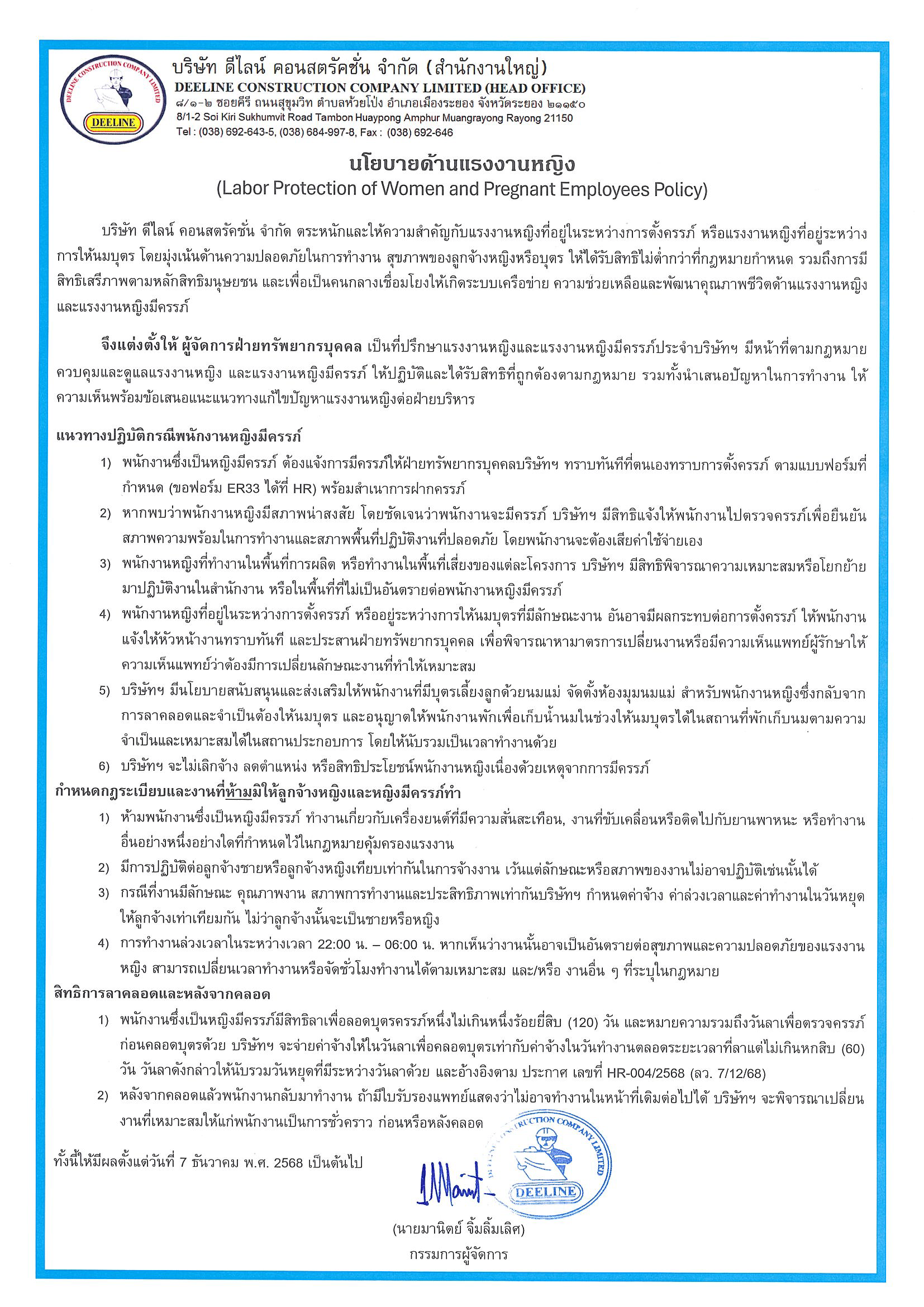 (Labor Protection of women and Pregnant Employees Policy, Rev.0, Issues date 16 May 2023)